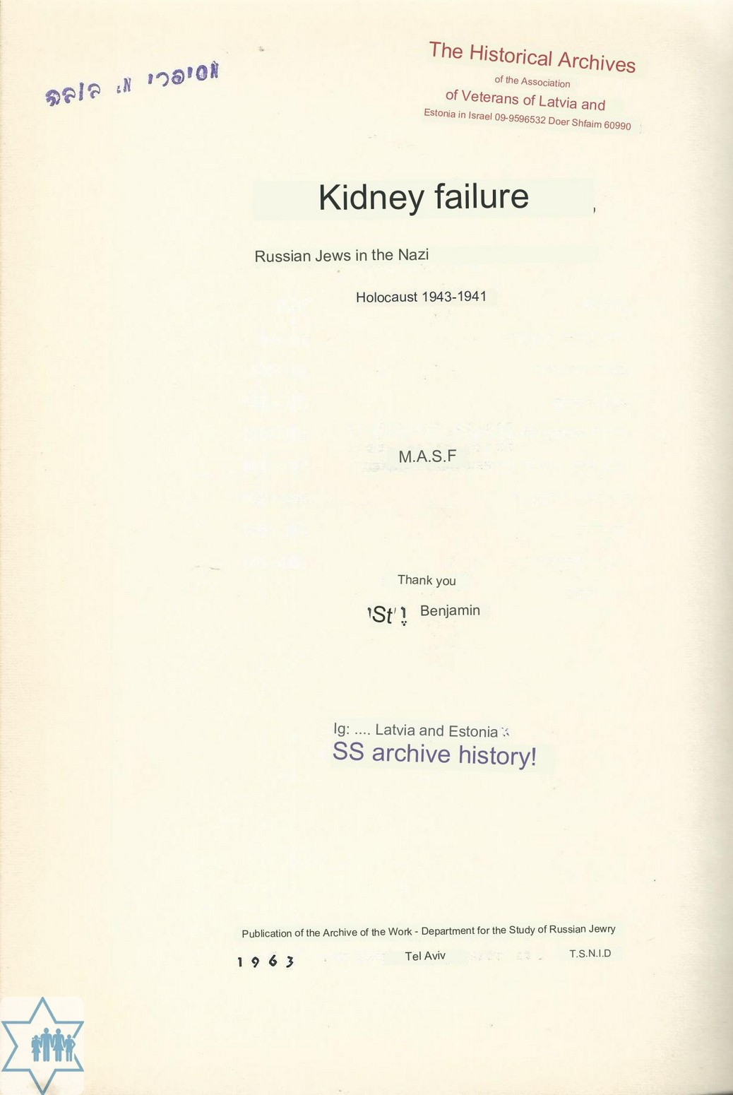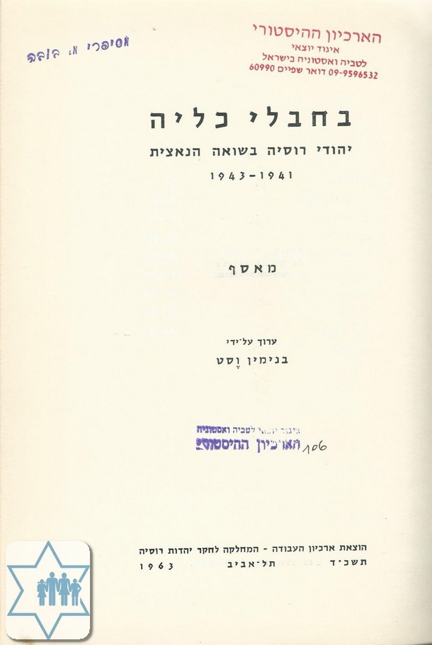 Pages 291 Place Tel Aviv Year 1963 Archive 106 Language Hebrew Author in original language וסט בנימין Name of book in original language בחבלי כליה