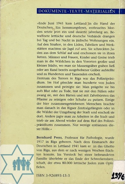 Pages 178 Place Berlin Year 1992 Archive 1346 Language German Author in original language Press Bernhard Name of book in original language Judenmord in Lettland 1941 – 1945 Comments Office – Bookcase # 19