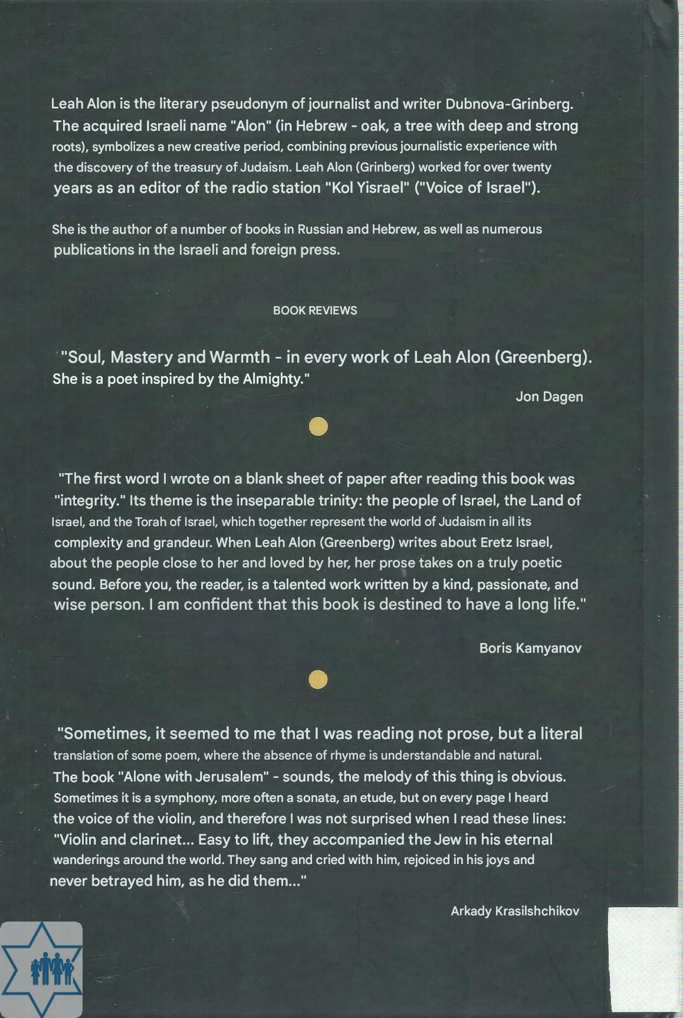 Pages 412 Place Jerusalem Year 2012 Archive 1586 , 1682 Language Russian Author in original language Лея Алон (Гринберг) Name of book in original language Наедине с Иерусалимом Comments Избранные новеллы; очерки; эссе