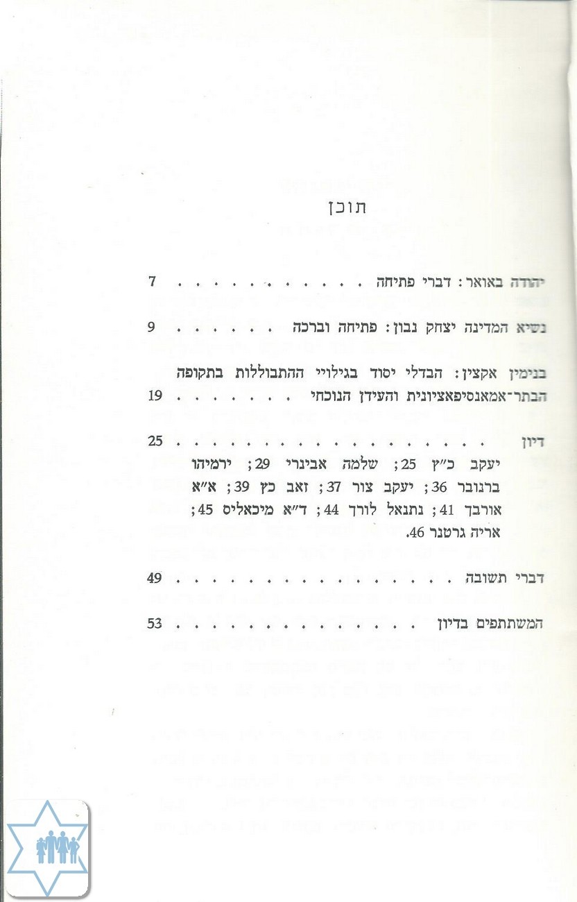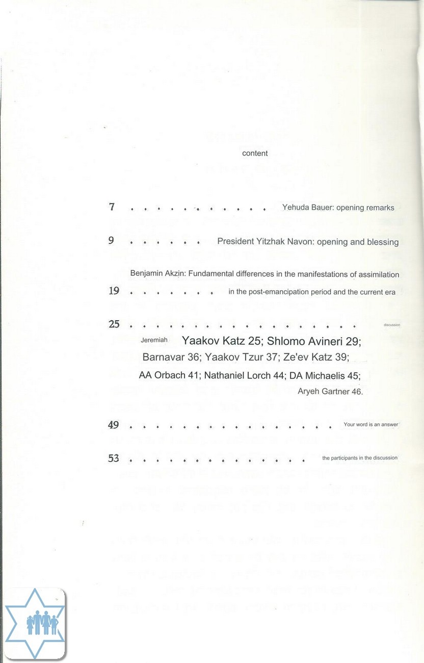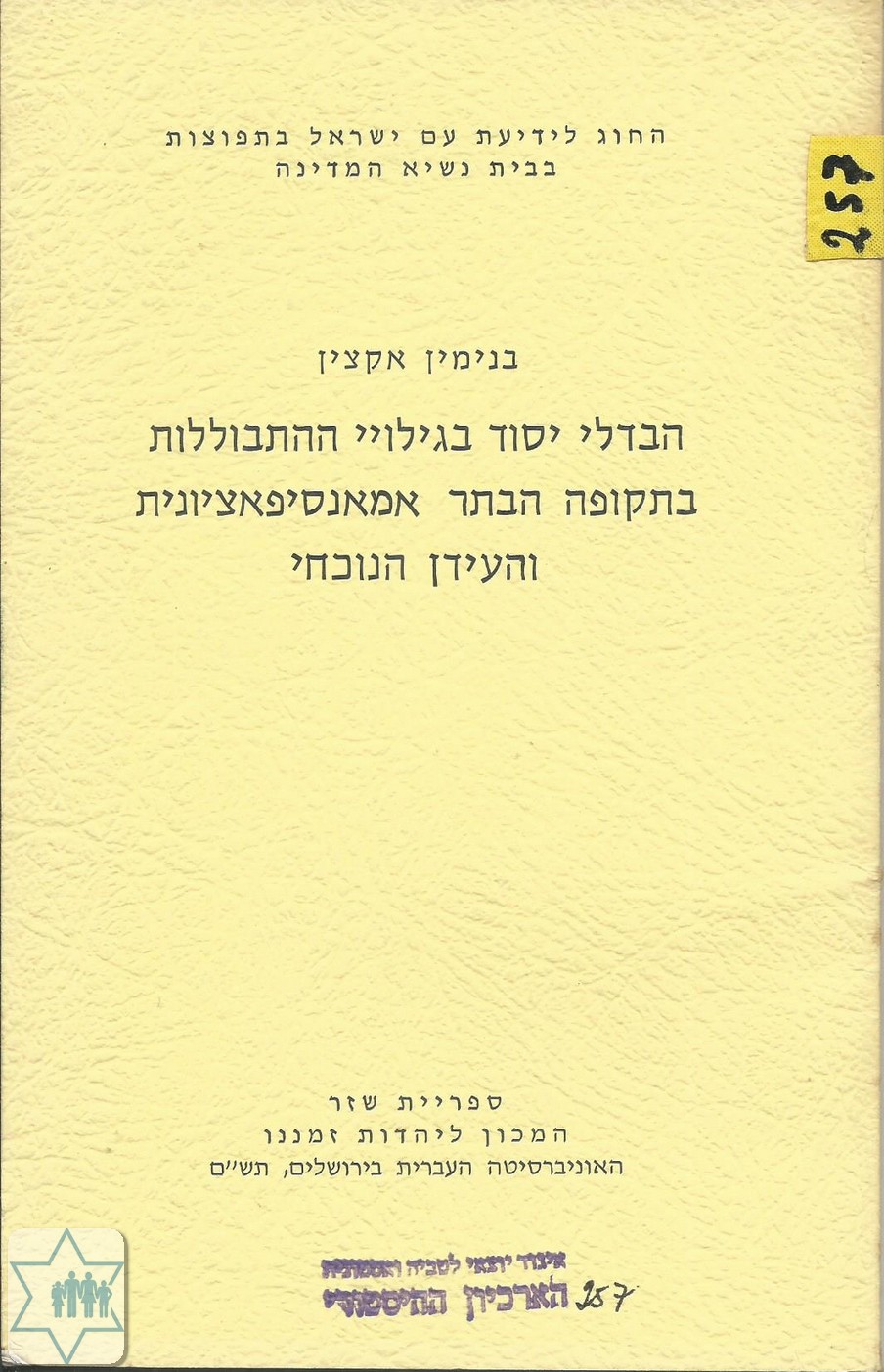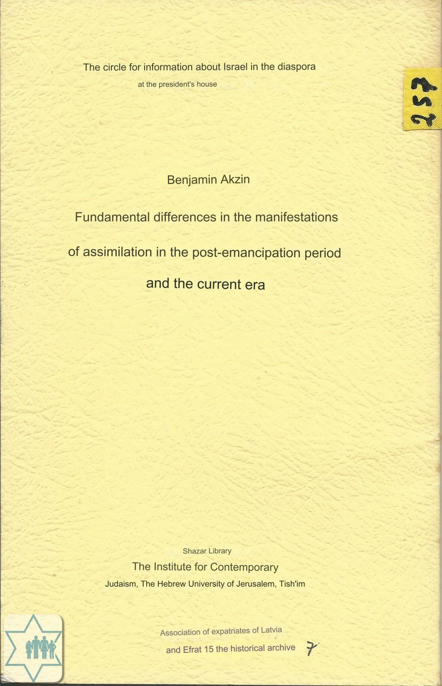 Pages 60 Place Jerusalem Year 1979 Archive 257 Language Hebrew Author in original language אקצין בנימין Name of book in original language הבדלי יסוד בגילוייההתבולות בתקופההבתר המאנסיפואציונית והעידן הנוכחי Comments About Assimilation