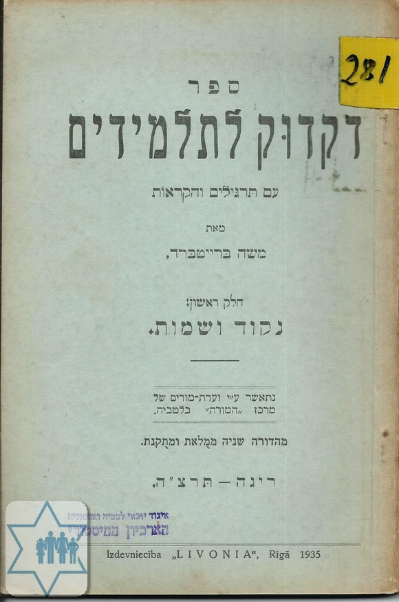 Pages 125 Place Riga Year 1935 Archive 281 Language Hebrew Author in original language ברייטבר משה Name of book in original language ספר דקדוק לתלמידים Comments Hebrew Grammar