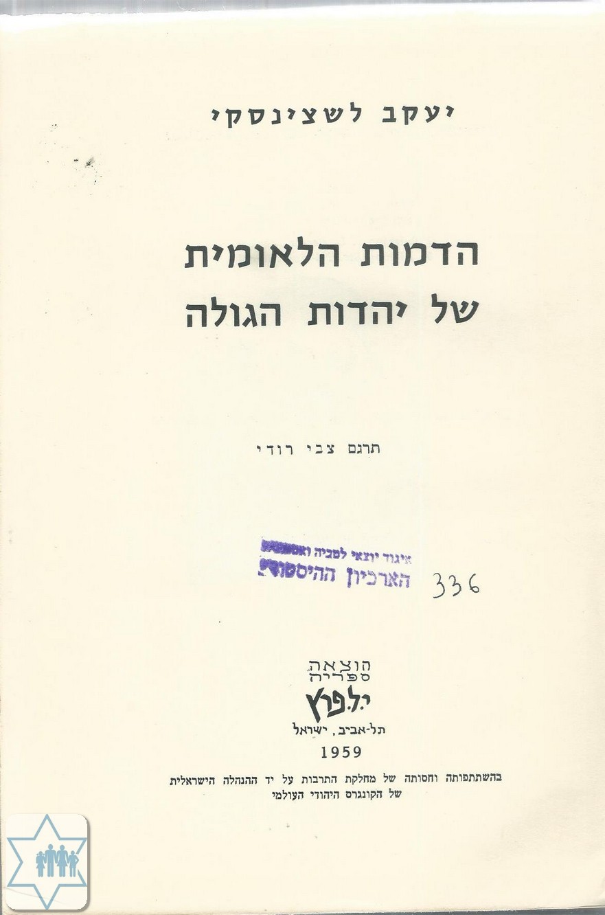Pages 410 Place Tel Aviv Year 1959 Archive 336 Language Hebrew Author in original language לשצינסקי יעקוב Name of book in original language הדמות הלאומית של יהדות הגולה