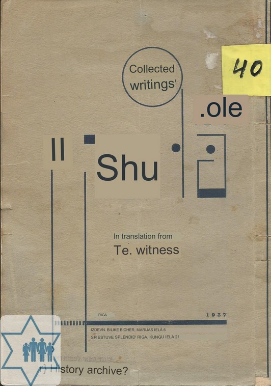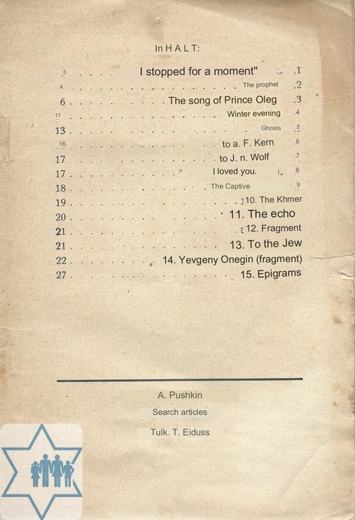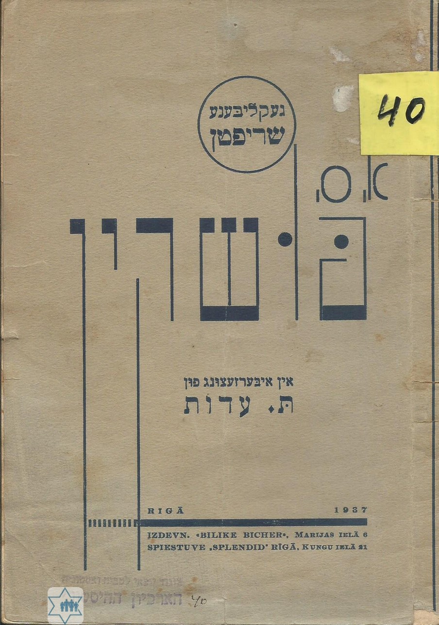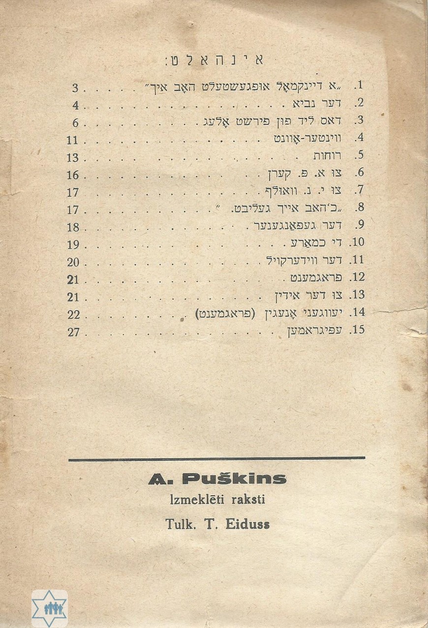 Pages 31 Place Riga Year 1937 Archive 40 Language Yiddish Author in original language עדות ת. Name of book in original language געקליבענע שריפטן פון פושקין א.ס