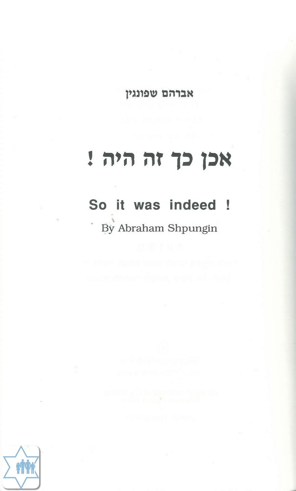 Pages 202 Place Tel Yitzhak Year 1994 Archive 502 , 503 , 1494 , 1736 Language Hebrew Author in original language שפונגין אברהם Name of book in original language אכן כך זה היה