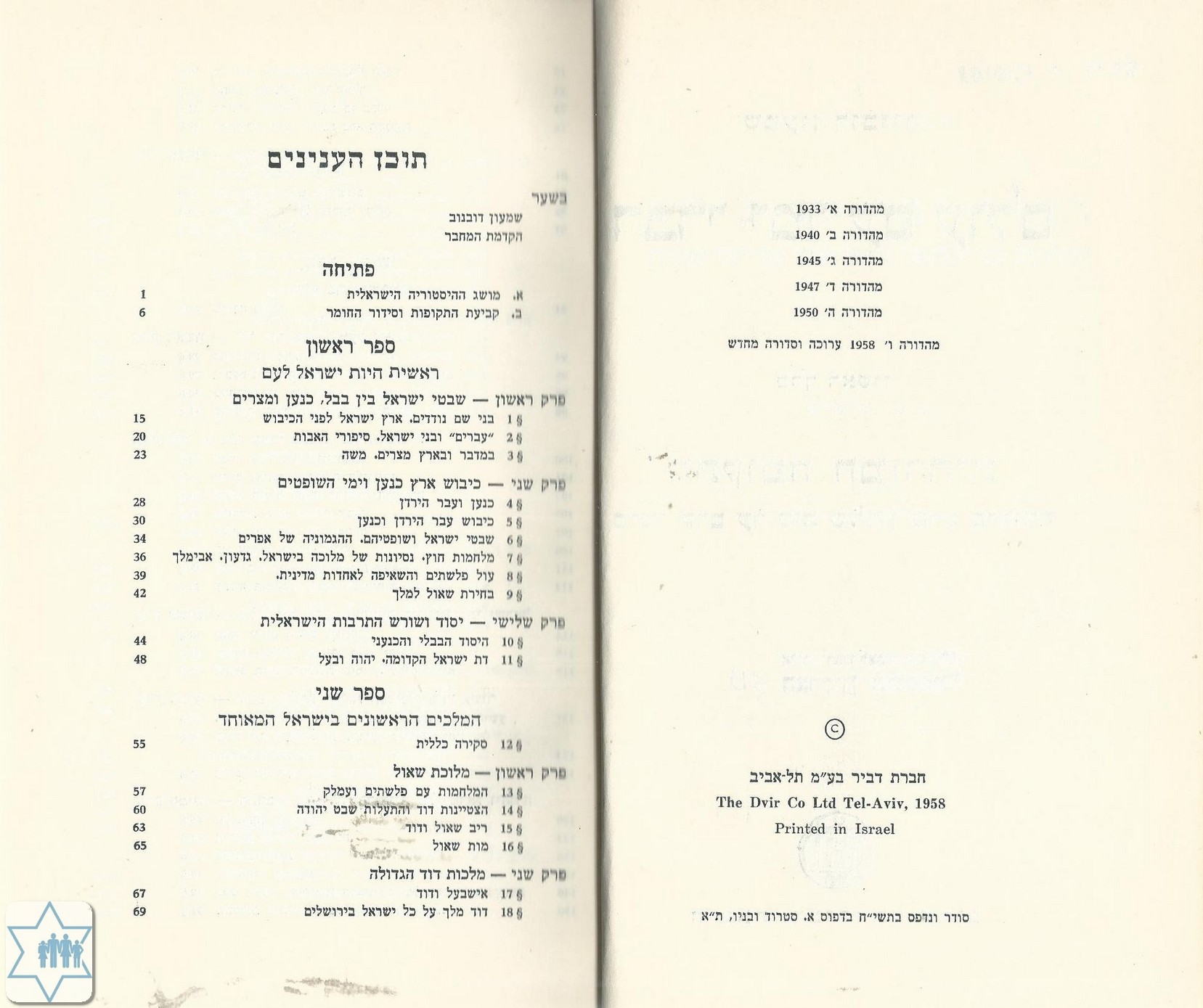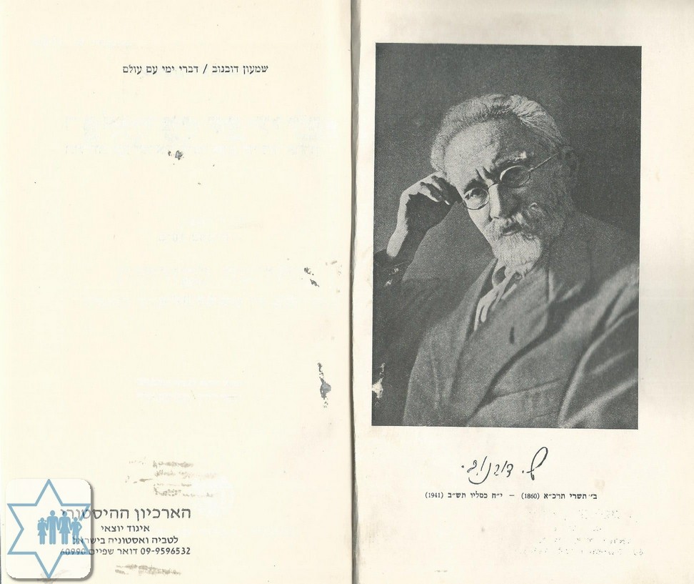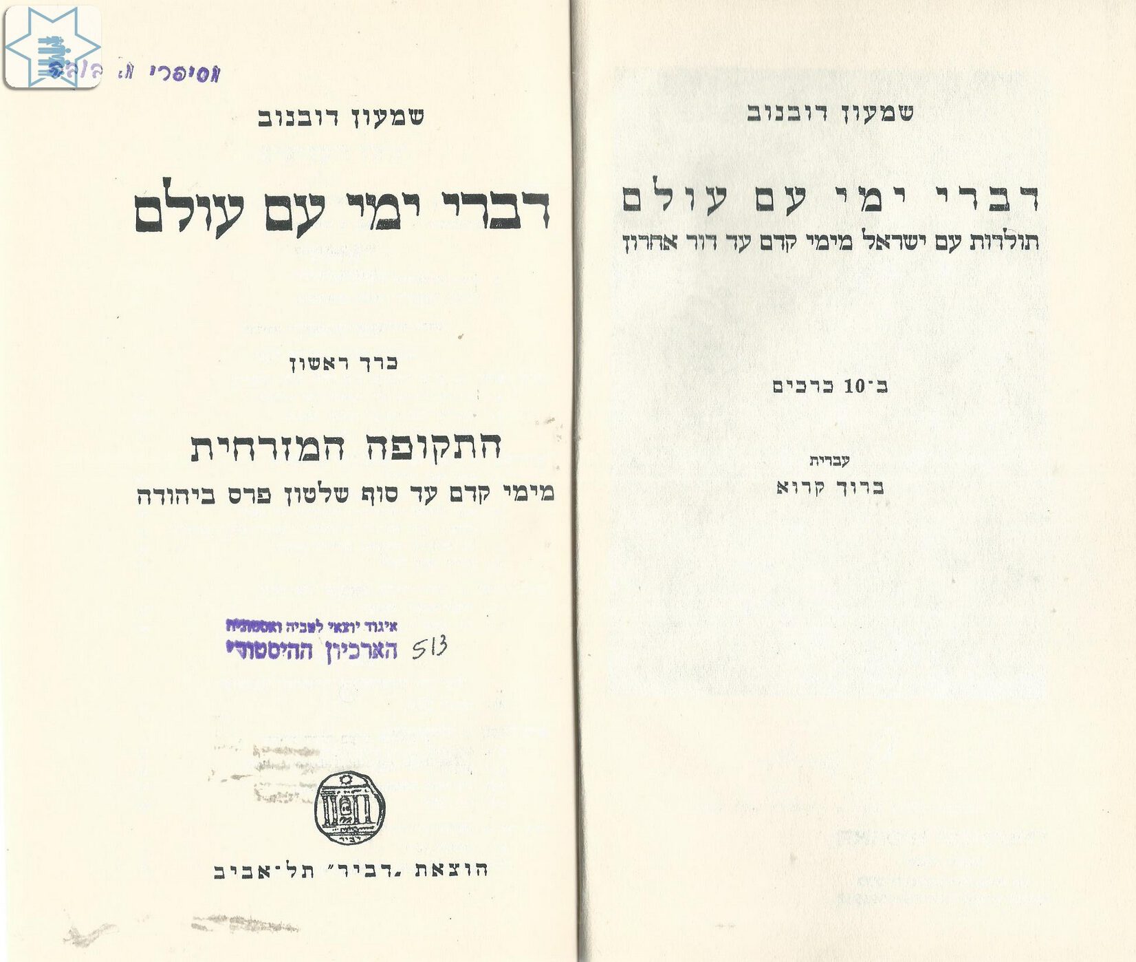 Pages 287 Place Tel Aviv Year 1958 Archive 513 Language Hebrew Author in original language דובנוב שמעון Name of book in original language דבר ימי עם עולם. כרך ראשון