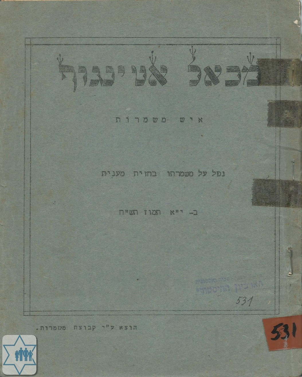 Pages 19 Place Mishmarot Year Archive 531 Language Hebrew Name of book in original language מכאל אטינגוף איש משמרות Comments In memory of
