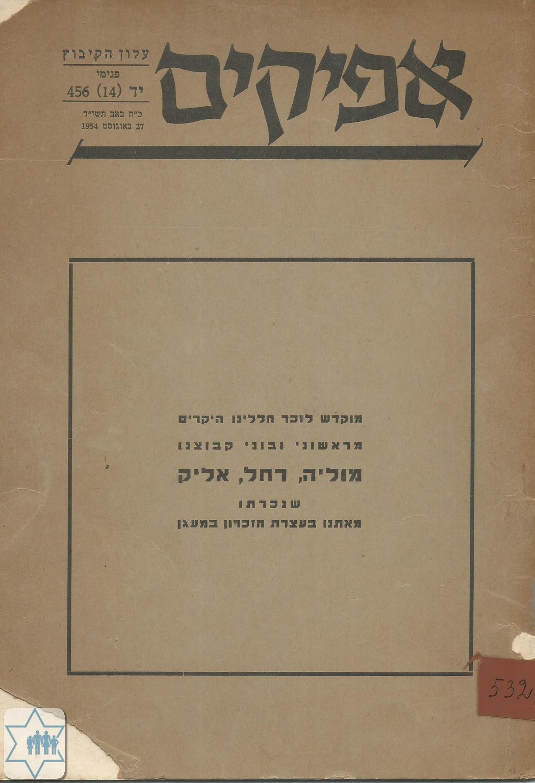 Place Afikim Year 1954 Archive 532 Language Hebrew Name of book in original language אפיקים, מוקדש לזכר חללינו היקרים Comments In memory of