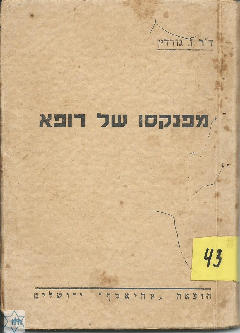 Pages 63 Place Jerusalem Year 1940 Archive 734 , 360 , 43 Language Hebrew Author in original language גורדין זלמן ד"ר Name of book in original language מפנקסו של רופא