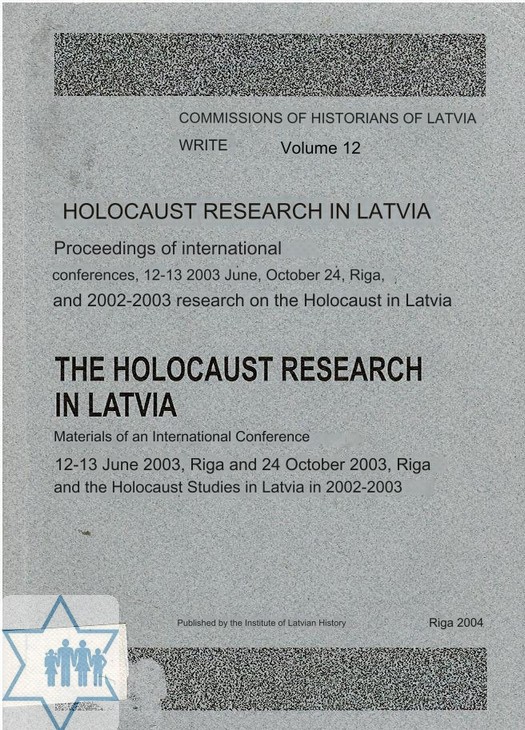 Pages 416 Place Riga Year 2004 Archive 877 , 1021 Language Latvian Author in original language Erglis Dzintars Name of book in original language Holokausta Izpetes problemas Latvia. 12 sejums Comments Symposium of the Commission