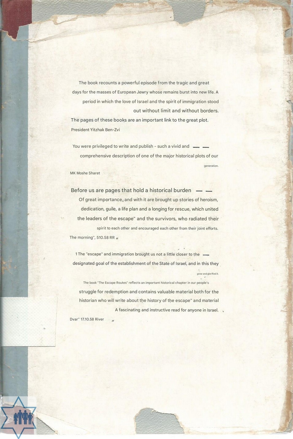 Pages 300 Place Israel Year 1959 Archive 967 ; 968 Language Hebrew Author in original language דקל אפרים Name of book in original language בנתיבי ה"בריחה" – ספר ראשון